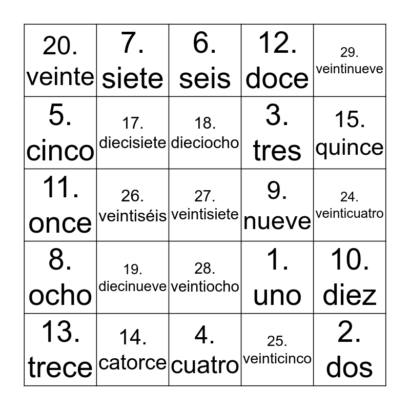This bingo card has 27 words: 1. uno, 2. dos, 3. tres, 4. cuatro, 5. cinco, 6. seis, 7. siete, 8. ocho, 9. nueve, 10. diez, 11. once, 12. doce, 13. trece, 14. catorce, 15. quince, 16. dieciséis, 17. diecisiete, 18. dieciocho, 19. diecinueve, 20. veinte, 24. veinticuatro, 25. veinticinco, 26. veintiséis, 27. veintisiete, 28. veintiocho, 29. veintinueve and 30. treinta.