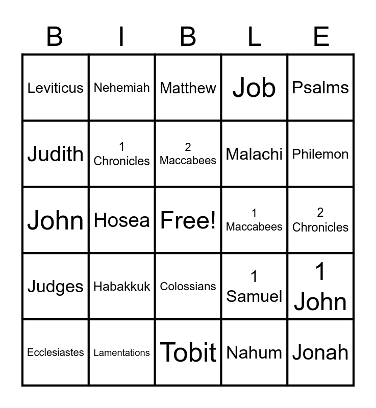 This bingo card has a free space and 73 words: Genesis, Exodus, Leviticus, Numbers, Deuteronomy, Joshua, Judges, Ruth, 1 Samuel, 2 Samuel, 1 Kings, 2 Kings, 1 Chronicles, 2 Chronicles, Ezra, Nehemiah, Tobit, Judith, Esther, 1 Maccabees, 2 Maccabees, Job, Psalms, Proverbs, Ecclesiastes, Song of Songs, Wisdom, Sirach, Isaiah, Jeremiah, Lamentations, Baruch, Ezekiel, Daniel, Hosea, Joel, Amos, Obadiah, Jonah, Micah, Nahum, Habakkuk, Zephaniah, Haggai, Zechariah, Malachi, Matthew, Mark, Luke, John, Acts of the Apostles, Romans, 1 Corinthians, 2 Corinthians, Galatians, Ephesians, Philippians, Colossians, 1 Thessalonians, 2 Thessalonians, 1 Timothy, 2 Timothy, Titus, Philemon, Hebrews, James, 1 Peter, 2 Peter, 1 John, 2 John, 3 John, Jude and Revelation.