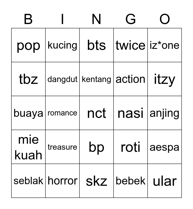 This bingo card has a free space and 24 words: treasure, horror, kentang, seblak, iz*one, pop, tbz, kucing, nasi, bp, action, buaya, roti, aespa, dangdut, bebek, anjing, bts, itzy, romance, ular, mie kuah, twice and skz.