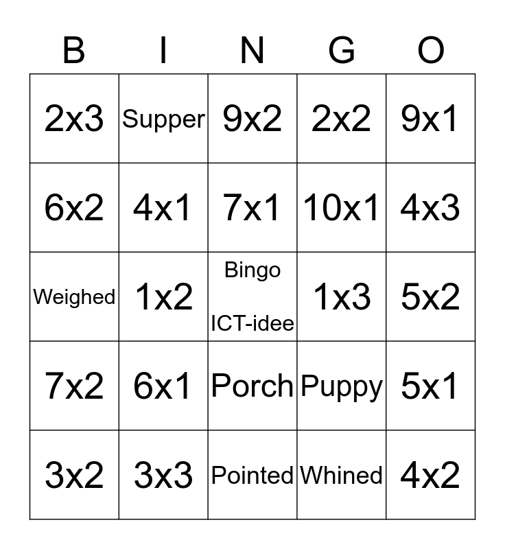 This bingo card has a free space and 38 words: 1x1, 2x1, 3x1, 4x1, 5x1, 6x1, 7x1, 8x1, 9x1, 10x1, 1x2, 2x2, 4x2, 5x2, 6x2, 7x2, 8x2, 9x2, 10x2, 1x3, 2x3, 3x3, 4x3, 3x2, Silent, Pointed, Floppy, Collars, Tornado, Field, Stream, Porch, Whined, Supper, Sniff, Puppy, Weighed and Worry.