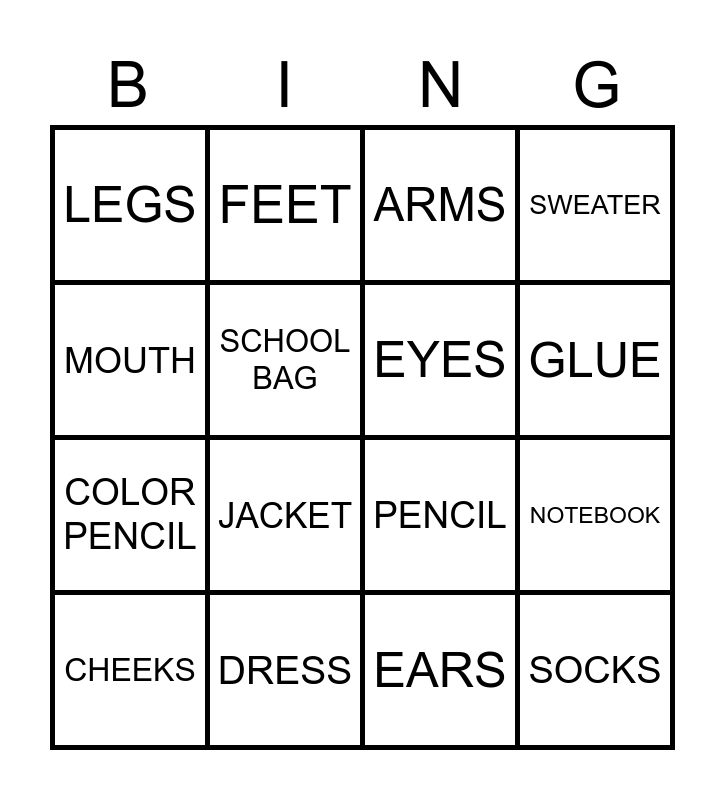 This bingo card has 16 words: DRESS, NOTEBOOK, ARMS, LEGS, COLOR PENCIL, FEET, PENCIL, EARS, MOUTH, SCHOOL BAG, CHEEKS, SWEATER, JACKET, GLUE, EYES and SOCKS.
