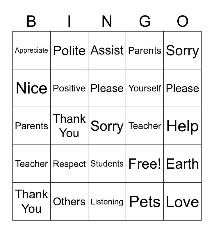 This bingo card has 25 words: Respect, Listening, Please, Thank You, Sorry, Appreciate, Nice, Polite, Teacher, Students, Yourself, Parents, Free!, Earth, Positive, Love, Help, Assist, Please, Thank You, Sorry, Others, Teacher, Parents and Pets.