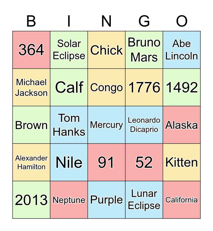 This bingo card has a free space and 24 words: Nile, Neptune, Congo, 2013, Abe Lincoln, 364, Michael Jackson, Solar Eclipse, Leonardo Dicaprio, 91, 1776, Brown, 52, Kitten, Calf, Lunar Eclipse, Alaska, Chick, 1492, Tom Hanks, California, Alexander Hamilton, Bruno Mars and Purple.