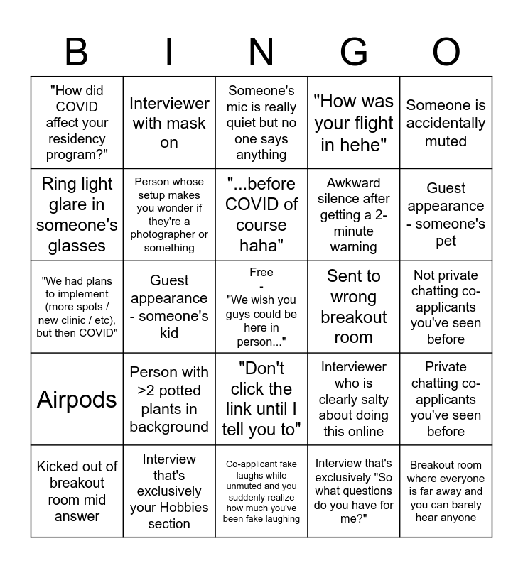 This bingo card has a free space and 24 words: Person with >2 potted plants in background, Interview that's exclusively your Hobbies section, "...before COVID of course haha", Kicked out of breakout room mid answer, Someone is accidentally muted, "How did COVID affect your residency program?", Ring light glare in someone's glasses, Interviewer with mask on, Sent to wrong breakout room, "Don't click the link until I tell you to", Awkward silence after getting a 2- minute warning, "We had plans to implement (more spots / new clinic / etc), but then COVID", Interviewer who is clearly salty about doing this online, Private chatting co-applicants you've seen before, Person whose setup makes you wonder if they're a photographer or something, Interview that's exclusively "So what questions do you have for me?", Not private chatting co-applicants you've seen before, Someone's mic is really quiet but no one says anything, Guest appearance - someone's pet, Guest appearance - someone's kid, Breakout room where everyone is far away and you can barely hear anyone, Airpods, "How was your flight in hehe" and Co-applicant fake laughs while unmuted and you suddenly realize how much you've been fake laughing.