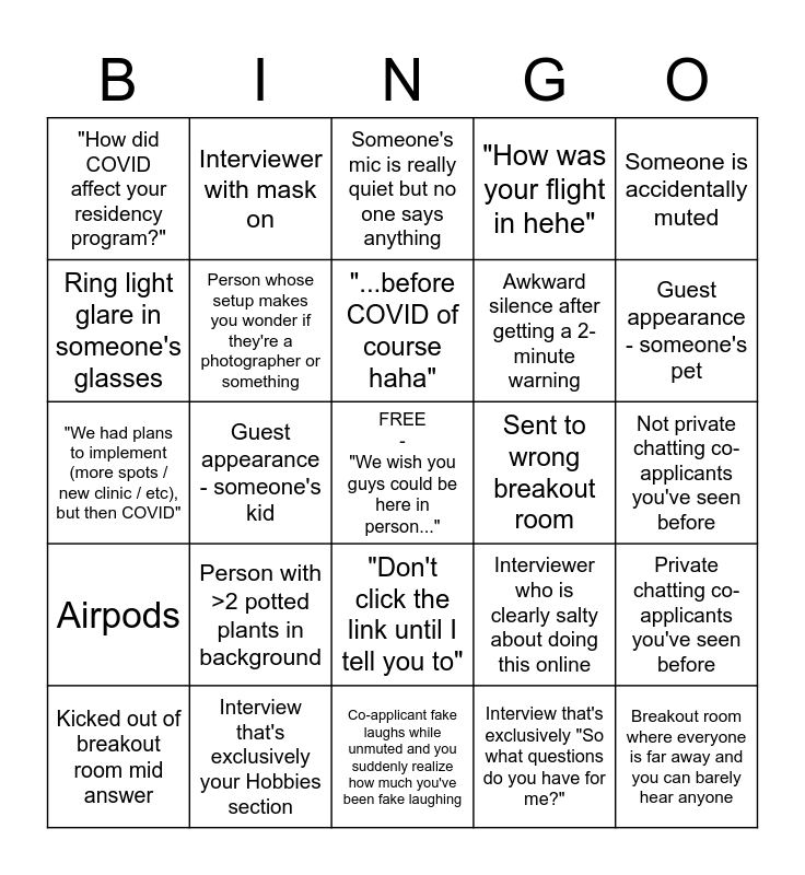 This bingo card has a free space and 24 words: Person with >2 potted plants in background, Interview that's exclusively your Hobbies section, "...before COVID of course haha", Kicked out of breakout room mid answer, Someone is accidentally muted, "How did COVID affect your residency program?", Ring light glare in someone's glasses, Interviewer with mask on, Sent to wrong breakout room, "Don't click the link until I tell you to", Awkward silence after getting a 2- minute warning, "We had plans to implement (more spots / new clinic / etc), but then COVID", Interviewer who is clearly salty about doing this online, Private chatting co-applicants you've seen before, Person whose setup makes you wonder if they're a photographer or something, Interview that's exclusively "So what questions do you have for me?", Not private chatting co-applicants you've seen before, Someone's mic is really quiet but no one says anything, Guest appearance - someone's pet, Guest appearance - someone's kid, Breakout room where everyone is far away and you can barely hear anyone, Airpods, "How was your flight in hehe" and Co-applicant fake laughs while unmuted and you suddenly realize how much you've been fake laughing.