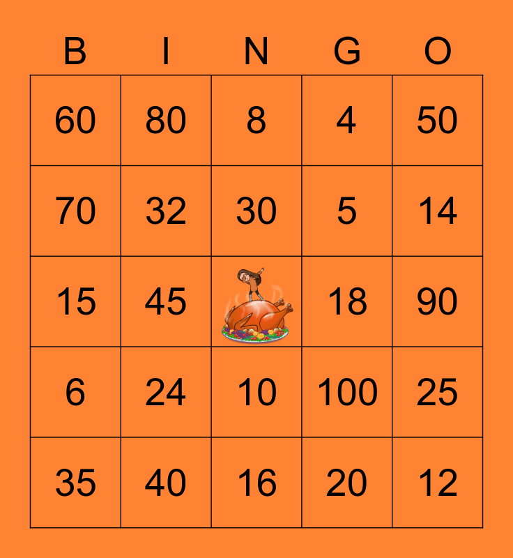 This bingo card has a free space and 26 words: 10, 20, 30, 40, 50, 60, 70, 80, 90, 100, 5, 15, 25, 35, 45, 2, 4, 6, 8, 12, 14, 16, 18, 24, 32 and 36.