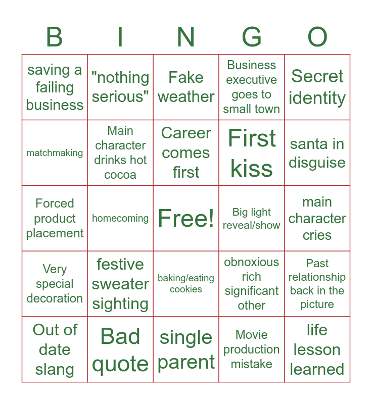 This bingo card has a free space and 39 words: Fun in the snow, Ice skating, True Love, Main character drinks hot cocoa, Out of date slang, baking/eating cookies, Career comes first, Wise friends from the past, Secret identity, Very special decoration, homecoming, Business executive goes to small town, life lesson learned, main character cries, Big light reveal/show, festive sweater sighting, characters colide, saving a failing business, Actor not proper age for character they are playing, obnoxious rich significant other, matchmaking, single parent, First kiss, santa in disguise, Learns to believe, Hallmark card worthy quote, Gingerbread house, Chance meeting at a bar, Serendipity, "nothing serious", Mean parents, Arranged marriage, Fake weather, Bad quote, Movie production mistake, Eggnog, Past relationship back in the picture, Forced product placement and perfect tree - real or fake.