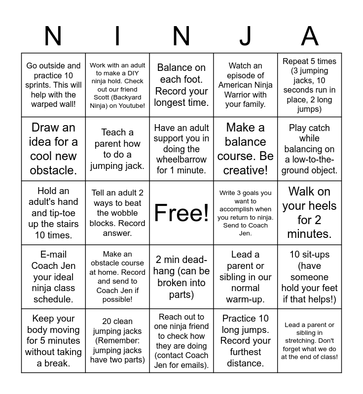 This bingo card has a free space and 24 words: Make an obstacle course at home. Record and send to Coach Jen if possible!, 20 clean jumping jacks (Remember: jumping jacks have two parts), Have an adult support you in doing the wheelbarrow for 1 minute., Keep your body moving for 5 minutes without taking a break., Repeat 5 times (3 jumping jacks, 10 seconds run in place, 2 long jumps), Go outside and practice 10 sprints. This will help with the warped wall!, Draw an idea for a cool new obstacle., Work with an adult to make a DIY ninja hold. Check out our friend Scott (Backyard Ninja) on Youtube!, Write 3 goals you want to accomplish when you return to ninja. Send to Coach Jen., 2 min dead-hang (can be broken into parts), Make a balance course. Be creative!, Hold an adult's hand and tip-toe up the stairs 10 times., Lead a parent or sibling in our normal warm-up., 10 sit-ups (have someone hold your feet if that helps!), Teach a parent how to do a jumping jack., Practice 10 long jumps. Record your furthest distance., Walk on your heels for 2 minutes., Balance on each foot. Record your longest time., Play catch while balancing on a low-to-the-ground object., Tell an adult 2 ways to beat the wobble blocks. Record answer., Lead a parent or sibling in stretching. Don't forget what we do at the end of class!, E-mail Coach Jen your ideal ninja class schedule., Watch an episode of American Ninja Warrior with your family. and Reach out to one ninja friend to check how they are doing (contact Coach Jen for emails)..