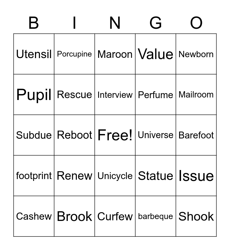 This bingo card has a free space and 25 words: Renew, Curfew, Interview, Cashew, Newborn, Utensil, Pupil, Porcupine, Universe, Unicycle, Perfume, Subdue, Statue, Issue, Rescue, Foolish, Barefoot, Maroon, Mailroom, Reboot, Shook, Brook, footprint, Value and barbeque.