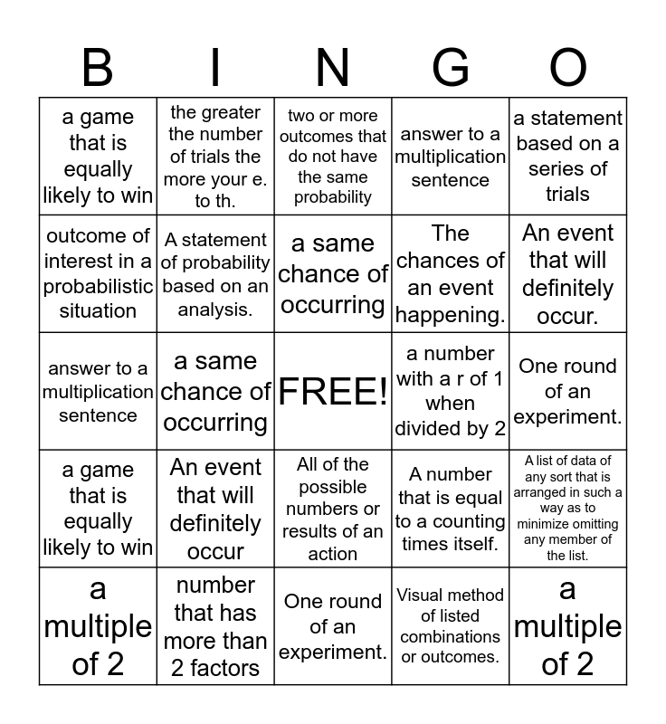 This bingo card has a free space and 24 words: An event that will definitely occur, number that has more than 2 factors, a same chance of occurring, a multiple of 2, a statement based on a series of trials, a game that is equally likely to win, outcome of interest in a probabilistic situation, the greater the number of trials the more your e. to th., a number with a r of 1 when divided by 2, All of the possible numbers or results of an action, The chances of an event happening., answer to a multiplication sentence, A number that is equal to a counting times itself., A list of data of any sort that is arranged in such a way as to minimize omitting any member of the list., A statement of probability based on an analysis., Visual method of listed combinations or outcomes., One round of an experiment., two or more outcomes that do not have the same probability, An event that will definitely occur., a same chance of occurring, a multiple of 2, a game that is equally likely to win, answer to a multiplication sentence and One round of an experiment..