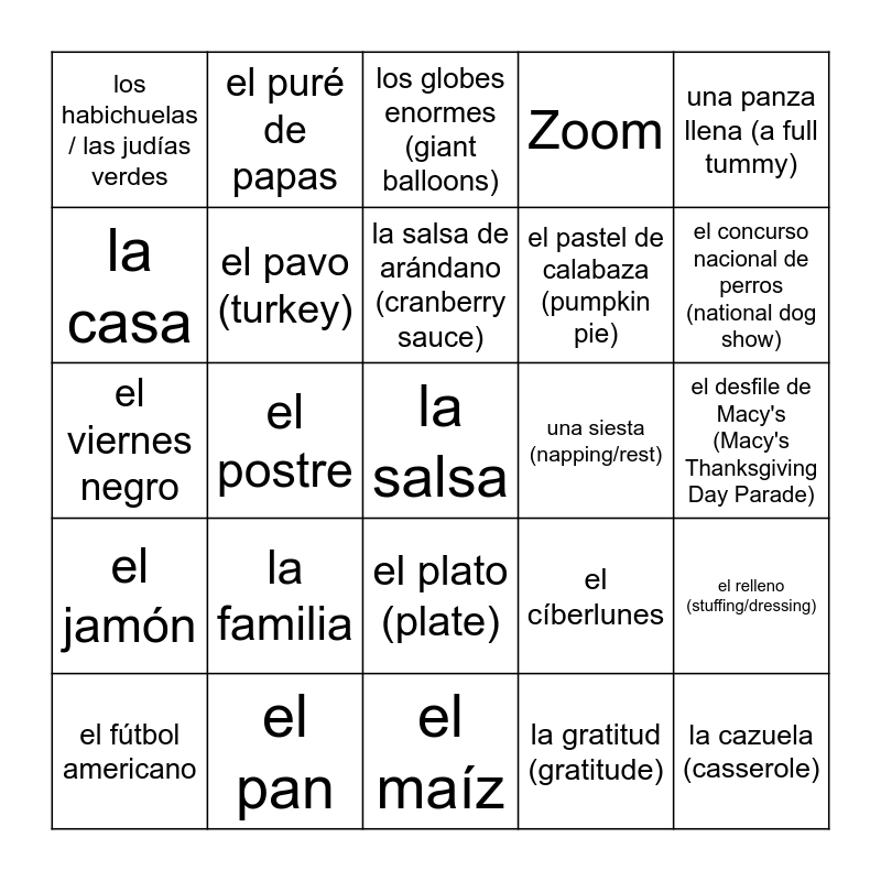 This bingo card has 25 words: la familia, el maíz, la salsa de arándano (cranberry sauce), el fútbol americano, una panza llena (a full tummy), los habichuelas / las judías verdes, la casa, el puré de papas, una siesta (napping/rest), el plato (plate), el pastel de calabaza (pumpkin pie), el viernes negro, el cíberlunes, el relleno (stuffing/dressing), el pavo (turkey), la cazuela (casserole), el desfile de Macy's (Macy's Thanksgiving Day Parade), los globes enormes (giant balloons), el concurso nacional de perros (national dog show), el postre, la salsa, el pan, el jamón, Zoom and la gratitud (gratitude).