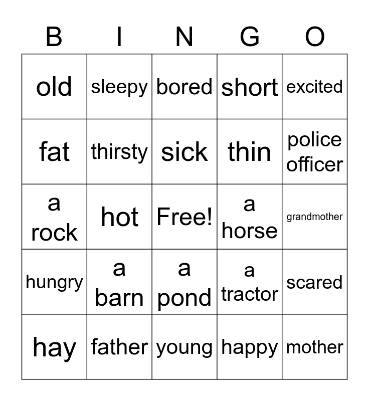This bingo card has a free space and 32 words: happy, sad, hot, cold, hungry, thirsty, excited, scared, sleepy, angry, sick, bored, a pig, a cow, a horse, a chicken, hay, a rock, a pond, a barn, a tractor, grandfather, grandmother, father, mother, short, thin, fat, old, young, firefighter and police officer.