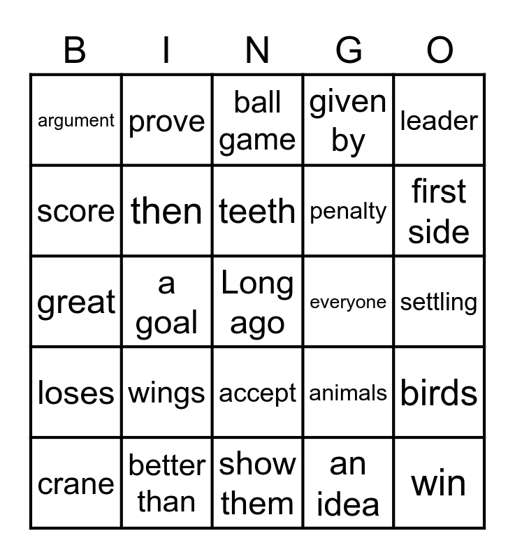 This bingo card has a free space and 24 words: wings, better than, teeth, crane, leader, argument, score, prove, everyone, accept, penalty, great, animals, birds, then, an idea, settling, ball game, first side, a goal, win, loses, given by and show them.