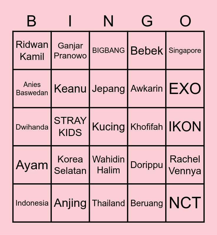 This bingo card has 25 words: Korea Selatan, Thailand, Jepang, Indonesia, Singapore, Ridwan Kamil, Anies Baswedan, Ganjar Pranowo, Khofifah, Wahidin Halim, Awkarin, Dwihanda, Dorippu, Rachel Vennya, Keanu, NCT, IKON, BIGBANG, EXO, STRAY KIDS, Kucing, Anjing, Ayam, Bebek and Beruang.