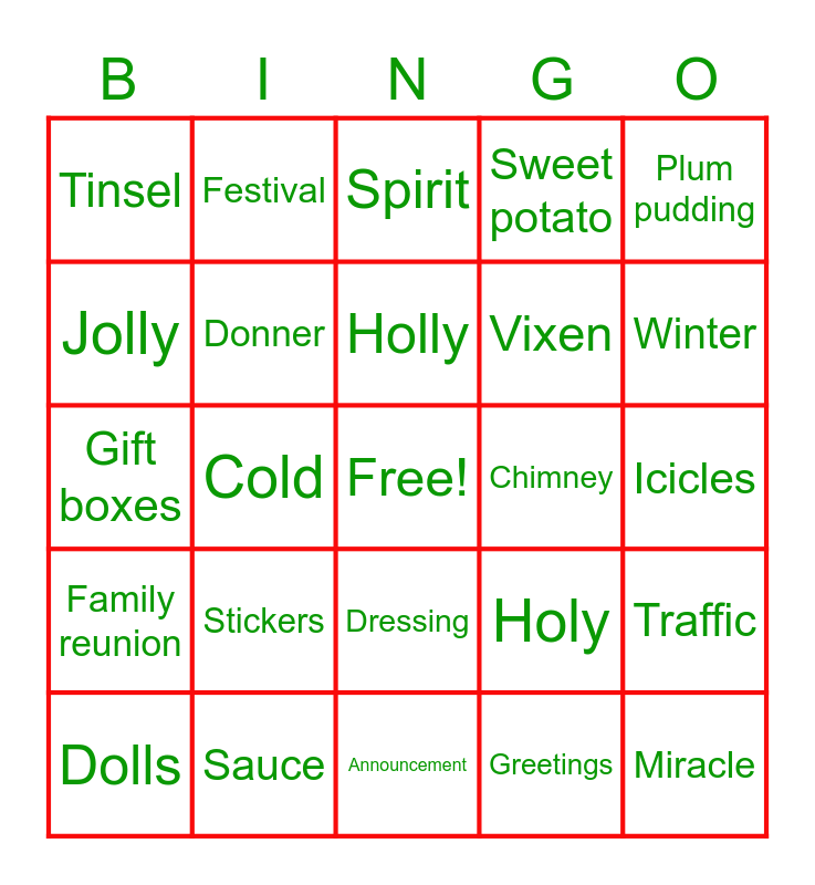 This bingo card has a free space and 100 words: Advent, Angels, Announcement, Bells, Bethlehem, Blitzen, Candles, Candy, Candy canes, Cards, Cedar, Celebrate, Ceremonies, Chimney, Christmas cookies, Christmas tree, Cold, Comet, Cranberry sauce, Crowds, Cupid, Dancer, Dasher, December, Decorations, Dolls, Donner, Dressing, Eggnog, Elves, Family reunion, Festival, Fir, Frosty, Fruitcake, Gift boxes, Gifts, Goodwill, Greetings, Ham, Happy, Holiday, Holly, Holy, Icicles, Jolly, Lights, Lists, Merry, Miracle, Mistletoe, New Year, Noel, North Pole, Pageant, Parades, Party, Pie, Pine, Plum pudding, Poinsettia, Prancer, Presents, Pumpkin pie, Punch, Red/green, Reindeer, Ribbon, Rudolph, Sacred, Sales, Sauce, Scrooge, Season, Sled, Sleighbells, Snowflakes, Spirit, St. Nick, Stand, Star, Stickers, Stocking stuffers, Sweet potato, Tidings, Tinsel, Togetherness, Toys, Tradition, Traffic, Trips, Turkey, Vacation, Vixen, Winter, Worship, Wrapping paper, Wreath, Yule and Yuletide.