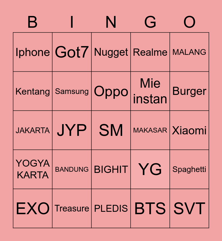 This bingo card has 25 words: BANDUNG, PLEDIS, Oppo, EXO, MALANG, Iphone, Kentang, Got7, MAKASAR, BIGHIT, Mie instan, JAKARTA, YG, Spaghetti, Samsung, SVT, Xiaomi, Nugget, Burger, JYP, SM, Treasure, YOGYA KARTA, Realme and BTS.