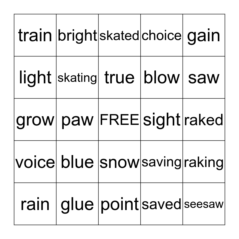 This bingo card has a free space and 24 words: blue, glue, true, rain, gain, train, light, bright, sight, snow, blow, grow, saving, raking, skating, saved, raked, skated, saw, paw, seesaw, voice, choice and point.
