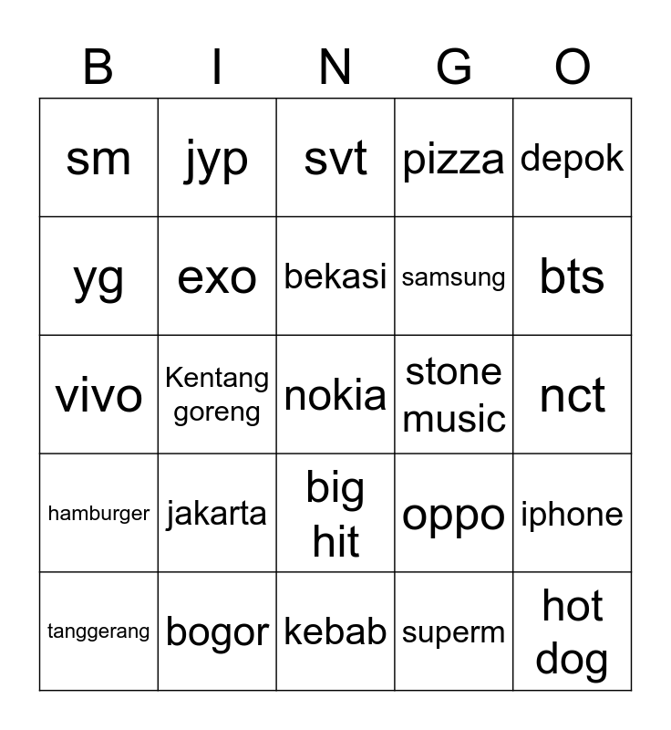 This bingo card has a free space and 24 words: jakarta, bogor, bekasi, tanggerang, depok, sm, yg, jyp, stone music, big hit, samsung, vivo, oppo, iphone, exo, superm, nct, svt, bts, Kentang goreng, hot dog, hamburger, pizza and kebab.