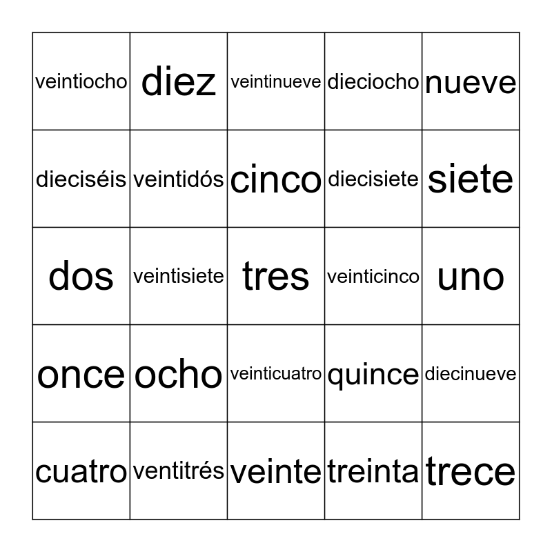 This bingo card has 30 words: ventitrés, veintiúno, veintisiete, veintiséis, veintiocho, veintinueve, veintidós, veinticuatro, veinticinco, veinte, uno, tres, treinta, trece, siete, seis, quince, once, ocho, nueve, dos, doce, diez, diecisiete, dieciséis, dieciocho, diecinueve, cuatro, cinco and catorce.