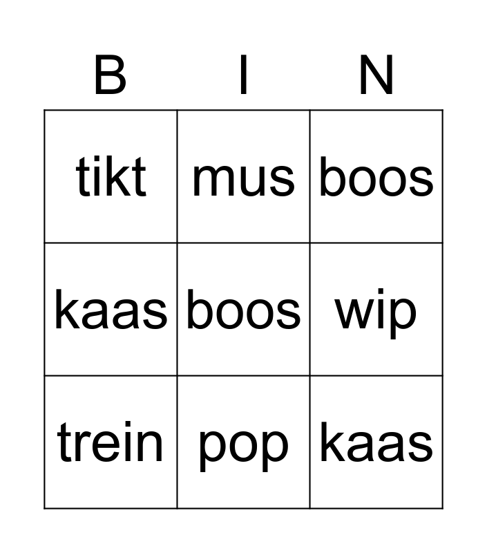 ⚠ This card has duplicate items: eet (2), trein (2), pop (2), kast (2), boos (2), tikt (2), wip (2), leuk (2), kaas (2), wei (2)