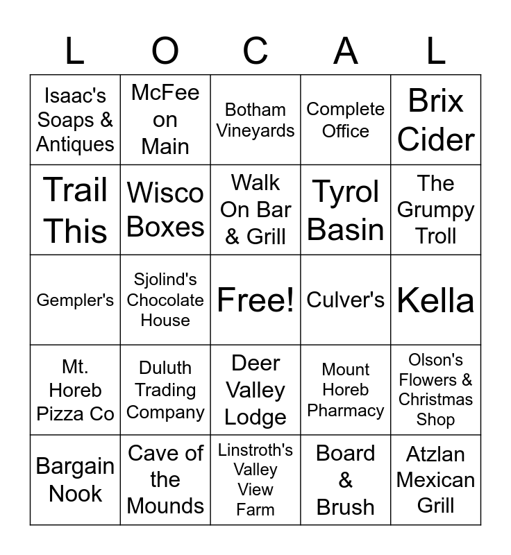 This bingo card has a free space and 45 words: 114 Main, Atzlan Mexican Grill, Aqua Shine Car Wash, Bargain Nook, Bistro 101, Board & Brush, Botham Vineyards, Bergey Jewelry, Brix Cider, Cave of the Mounds, Complete Office, Culver's, Deer Valley Lodge, Duluth Trading Company, EP Graphics, Linstroth's Valley View Farm, Mark It, Gempler's, Gerber Leisure Products, The Grumpy Troll, McFee on Main, Hi Point Steakhouse, icki sticki, Isaac's Soaps & Antiques, Jada's Garden Greenhouse, Kella, Nork Golf Club, Miller & Sons Supermarket, Mount Horeb Pharmacy, Mt. Horeb Pizza Co, Munchkey Apples, Olson's Flowers & Christmas Shop, Open House Imports, Pizza Hut, The Pop Place, Sjolind's Chocolate House, Skal Public House, Subway, Sunn Cafe, Walk On Bar & Grill, Trail This, Tyrol Basin, Walgreen's, Wisco Boxes and Mount Horeb Chamber of Commerce.