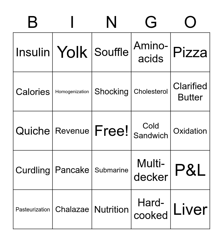 This bingo card has a free space and 34 words: Albumen, Hard-cooked, Bread, Filling, Curdling, Homogenization, Pizza, Pasteurization, Yolk, Ramekin, Shocking, Souffle, Spread, Crepe, Cold Sandwich, Clarified Butter, Chalazae, Quiche, Pancake, Multi-decker, Submarine, Sunny side up, Insulin, Oxidation, Nutrition, Liver, Amino-acids, Phytochemicals, Cholesterol, Calories, Pancreas, Revenue, P&L and Variable.