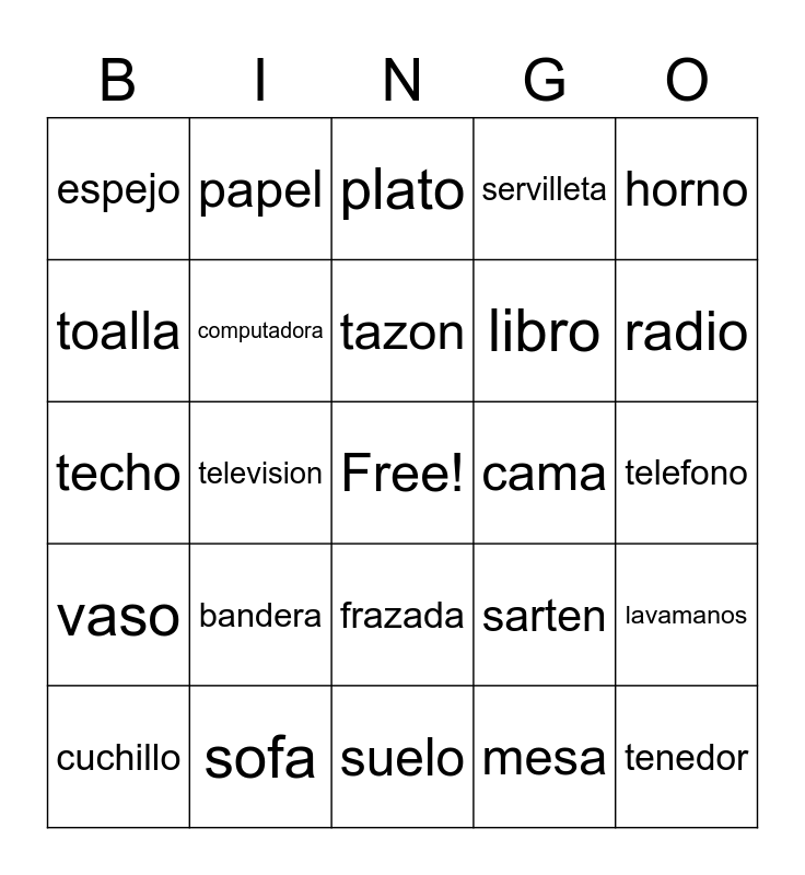 This bingo card has a free space and 24 words: bandera, sofa, tazon, cuchillo, horno, espejo, toalla, papel, cama, frazada, libro, techo, sarten, lavamanos, computadora, mesa, telefono, plato, radio, television, tenedor, vaso, servilleta and suelo.