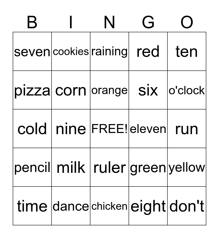 This bingo card has a free space and 49 words: do, don't, like, chicken, milk, juice, cookies, gimchi, pizza, potatoes, corn, red, yellow, green, blue, black, orange, eleven, twelve, ten, nine, eight, seven, six, five, o'clock, time, late, ruler, pencil, eraser, brush, scissors, crayon, dance, sing, ski, jump, run, swim, can, can't, sunny, hot, cold, raining, snowing, windy and weather.