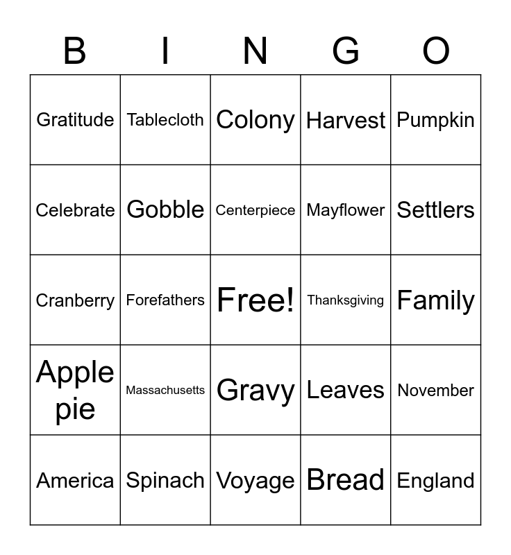 This bingo card has a free space and 29 words: America, Cornucopia, Forefathers, Scarecrow, Gratitude, Colony, Gobble, Massachusetts, Thanksgiving, Spinach, Family, England, Voyage, Bread, Settlers, Together, Gravy, Apple pie, Pumpkin, Cranberry, Leaves, Wishbone, Mayflower, Celebrate, Harvest, Tablecloth, November, Centerpiece and November.