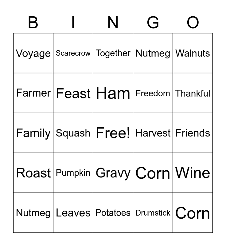 This bingo card has a free space and 24 words: Pumpkin, Leaves, Ham, Nutmeg, Walnuts, Voyage, Farmer, Scarecrow, Harvest, Gravy, Freedom, Family, Corn, Wine, Feast, Drumstick, Friends, Together, Thankful, Squash, Corn, Roast, Nutmeg and Potatoes.