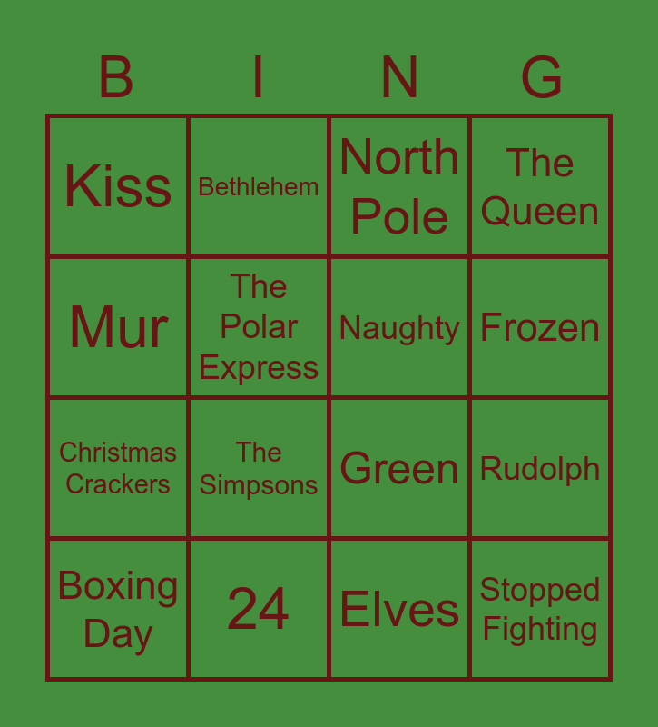 This bingo card has 20 words: Rudolph, Five Gold Rings, North Pole, Saint Nicholas, Boxing Day, Mur, 24, Kiss, Christmas Crackers, Bethlehem, The Simpsons, Green, The Polar Express, Stopped Fighting, Naughty, Turkey, Frozen, The Queen, Elves and Christmas Tree.