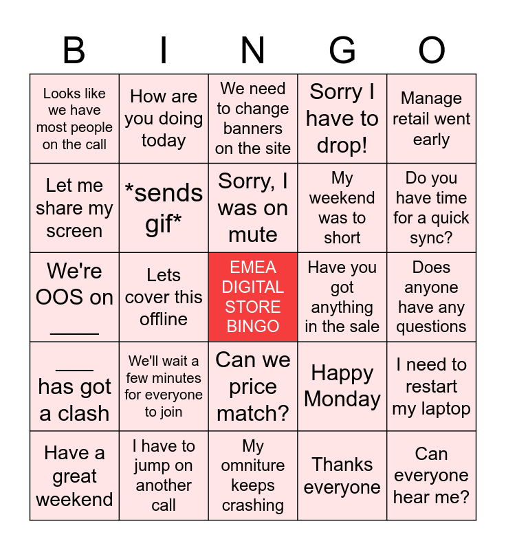 This bingo card has a free space and 24 words: We'll wait a few minutes for everyone to join, I have to jump on another call, Sorry, I was on mute, Have a great weekend, Manage retail went early, Looks like we have most people on the call, Let me share my screen, How are you doing today, Have you got anything in the sale, Can we price match?, My weekend was to short, We're OOS on ____, Happy Monday, I need to restart my laptop, *sends gif*, Thanks everyone, Does anyone have any questions, We need to change banners on the site, Do you have time for a quick sync?, Lets cover this offline, Can everyone hear me?, ___ has got a clash, Sorry I have to drop! and My omniture keeps crashing.