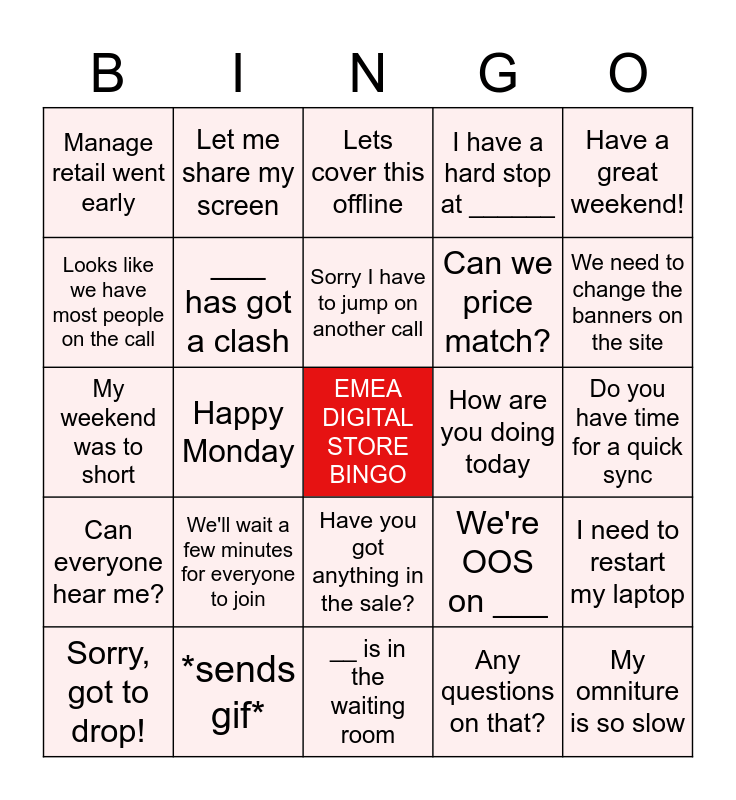 This bingo card has a free space and 24 words: We'll wait a few minutes for everyone to join, *sends gif*, Sorry I have to jump on another call, Sorry, got to drop!, Have a great weekend!, Manage retail went early, Looks like we have most people on the call, Let me share my screen, How are you doing today, Have you got anything in the sale?, Can we price match?, My weekend was to short, We're OOS on ___, I need to restart my laptop, ___ has got a clash, Any questions on that?, Do you have time for a quick sync, Lets cover this offline, We need to change the banners on the site, Happy Monday, My omniture is so slow, Can everyone hear me?, I have a hard stop at ______ and __ is in the waiting room.