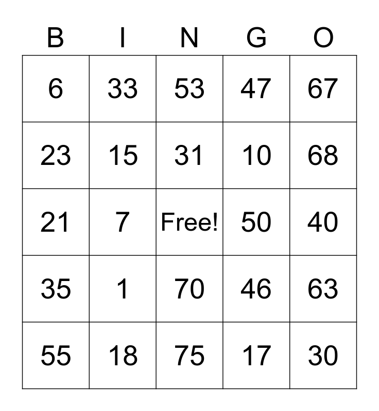 This bingo card has a free space and 24 words: 1, 18, 31, 55, 67, 6, 23, 33, 50, 70, 10, 21, 46, 63, 15, 17, 40, 53, 68, 7, 30, 35, 47 and 75.