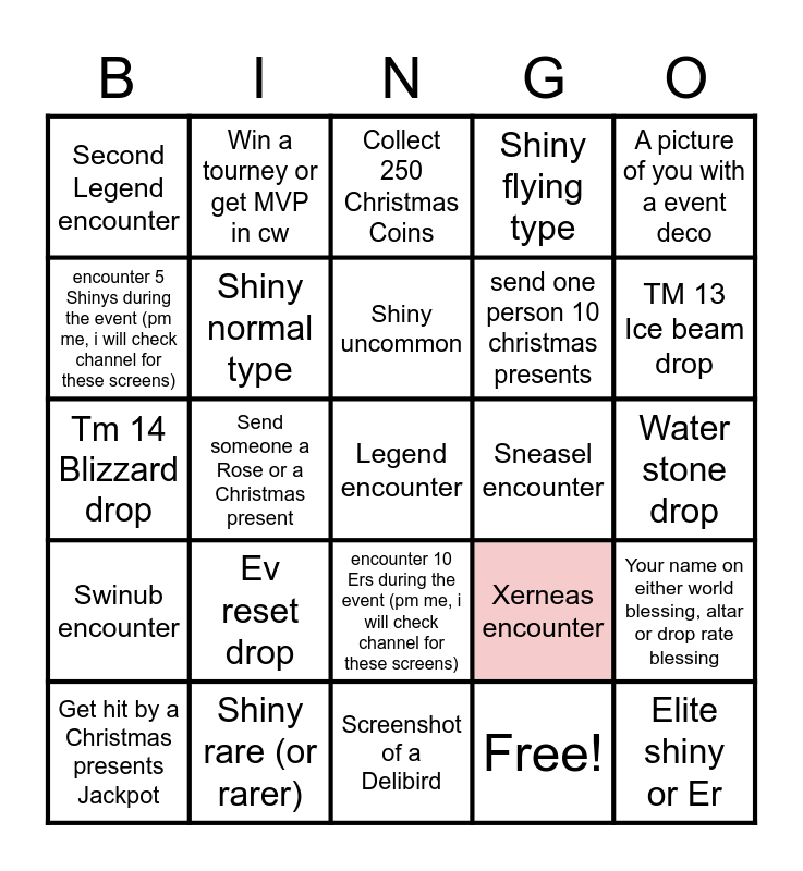 This bingo card has 25 words: Ev reset drop, Screenshot of a Delibird, Shiny uncommon, Get hit by a Christmas presents Jackpot, A picture of you with a event deco, Second Legend encounter, encounter 5 Shinys during the event (pm me, i will check channel for these screens), Win a tourney or get MVP in cw, Sneasel encounter, encounter 10 Ers during the event (pm me, i will check channel for these screens), send one person 10 christmas presents, Tm 14 Blizzard drop, Xerneas encounter, Your name on either world blessing, altar or drop rate blessing, Shiny normal type, Elite shiny or Er, Water stone drop, Collect 250 Christmas Coins, TM 13 Ice beam drop, Send someone a Rose or a Christmas present, Legend encounter, Shiny rare (or rarer), Swinub encounter, Shiny flying type and Free!.