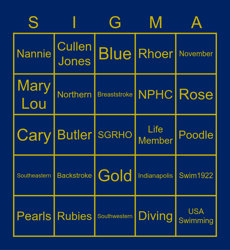 This bingo card has a free space and 42 words: Aurora, Breaststroke, Freestyle, Backstroke, Diving, Swim1922, USA Swimming, Royal, Blue, Gold, Poodle, Rose, Butler, November, Basileus, Indianapolis, Indian, Cary, Maritza McClendon, Cullen Jones, Mary Lou, Dorothy, Vivian, Nannie, Cubena, Hattie Mae, NPHC, Butterfly, Founders, Bessie Mae, Golden, Southeastern, Northern, Southwestern, Central, Pearls, Rubies, Life Member, Alumnae, Philo, Rhoer and Rhosebud.