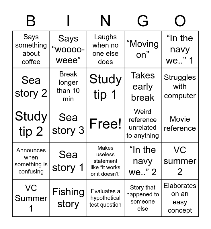 This bingo card has a free space and 24 words: Sea story 1, Fishing story, Study tip 1, VC Summer 1, “In the navy we..” 1, Says something about coffee, Sea story 2, Says “woooo-weee”, Weird reference unrelated to anything, Makes useless statement like “it works or it doesn’t”, Takes early break, Study tip 2, “In the navy we..” 2, VC summer 2, Break longer than 10 min, Story that happened to someone else, Movie reference, Laughs when no one else does, Struggles with computer, Sea story 3, Elaborates on an easy concept, Announces when something is confusing, “Moving on” and Evaluates a hypothetical test question.