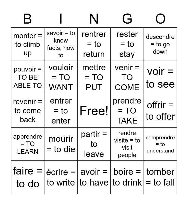 This bingo card has a free space and 32 words: faire = to do, être = to be, avoir = to have, aller = to go, offrir = to offer, pouvoir = TO BE ABLE TO, vouloir = TO WANT, devoir = TO HAVE TO, venir = TO COME, devenir = to become, revenir = to come back, savoir = to know facts, how to, connaître = to know people, places, boire = to drink, voir = to see, dire = TO SAY, écrire = to write, mettre = TO PUT, prendre = TO TAKE, comprendre = to understand, apprendre = TO LEARN, sortir = to go out, partir = to leave, rendre visite = to visit people, descendre = to go down, monter = to climb up, entrer = to enter, rentrer = to return, rester = to stay, tomber = to fall, naître = to be born and mourir = to die.