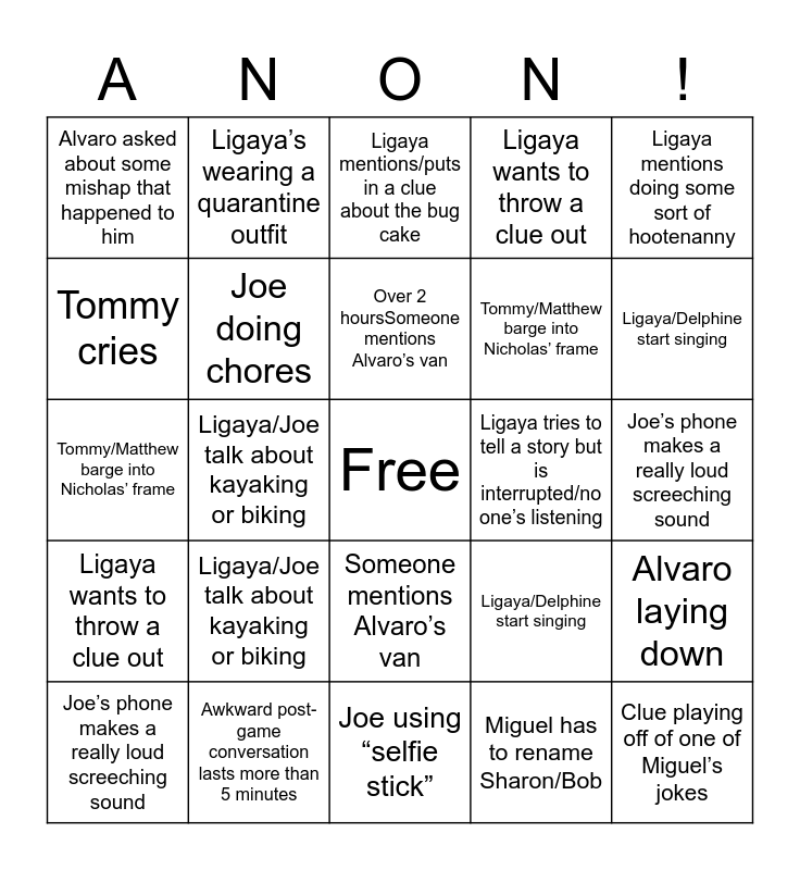 This bingo card has a free space and 55 words: “Joe you’re muted”, Joe’s phone makes a really loud screeching sound, Alvaro laying down, Alvaro asked about some mishap that happened to him, Joe using “selfie stick”, Joe eating, Joe doing chores, Tommy cries, Tommy/Matthew barge into Nicholas’ frame, Sharon’s Alexa is on, Ligaya wants to throw a clue out, Ligaya talks about making rules for the clues (includes the word “article”), Clue about Uncle Norman, Ligaya’s wearing a quarantine outfit, Alliteration clue, Clue involving something toilet-related, Ligaya mentions doing some sort of hootenanny, Ligaya/Joe talk about kayaking or biking, Awkward post-game conversation lasts more than 5 minutes, Clue playing off of one of Miguel’s jokes, Ligaya tries to tell a story but is interrupted/no one’s listening, Ligaya interrupts someone, Ligaya/Delphine start singing, Ligaya mentions/puts in a clue about the bug cake, One of the Pizzello boys needs Delphine for something, Over 2 hoursSomeone mentions Alvaro’s van, Miguel has to rename Sharon/Bob, “Joe you’re muted”, Joe’s phone makes a really loud screeching sound, Alvaro laying down, Alvaro asked about some mishap that happened to him, Joe using “selfie stick”, Joe eating, Joe doing chores, Tommy cries, Tommy/Matthew barge into Nicholas’ frame, Sharon’s Alexa is on, Ligaya wants to throw a clue out, Ligaya talks about making rules for the clues (includes the word “article”), Clue about Uncle Norman, Ligaya’s wearing a quarantine outfit, Alliteration clue, Clue involving something toilet-related, Ligaya mentions doing some sort of hootenanny, Ligaya/Joe talk about kayaking or biking, Awkward post-game conversation lasts more than 5 minutes, Clue playing off of one of Miguel’s jokes, Ligaya tries to tell a story but is interrupted/no one’s listening, Ligaya interrupts someone, Ligaya/Delphine start singing, Ligaya mentions/puts in a clue about the bug cake, One of the Pizzello boys needs Delphine for something, Over 2 hours, Someone mentions Alvaro’s van and Miguel has to rename Sharon/Bob.