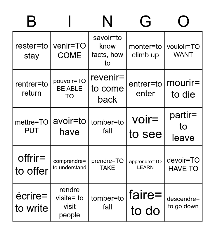 This bingo card has a free space and 32 words: faire= to do, être= to be, avoir=to have, aller= to go, offrir= to offer, pouvoir=TO BE ABLE TO, vouloir=TO WANT, devoir=TO HAVE TO, venir=TO COME, devenir=to become, revenir= to come back, savoir=to know facts, how to, connaître=to know people, places, boire= to drink, voir= to see, dire=TO SAY, écrire= to write, mettre=TO PUT, prendre=TO TAKE, comprendre= to understand, apprendre=TO LEARN, sortir= to go out, partir= to leave, rendre visite= to visit people, descendre= to go down, monter=to climb up, entrer=to enter, rentrer=to return, rester=to stay, tomber=to fall, naître=to be born and mourir= to die.