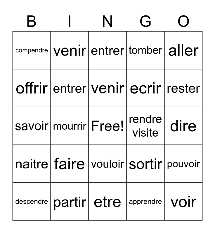This bingo card has a free space and 24 words: faire, partir, venir, descendre, aller, compendre, offrir, venir, rendre visite, vouloir, ecrir, savoir, sortir, pouvoir, entrer, apprendre, dire, entrer, rester, mourrir, voir, naitre, tomber and etre.