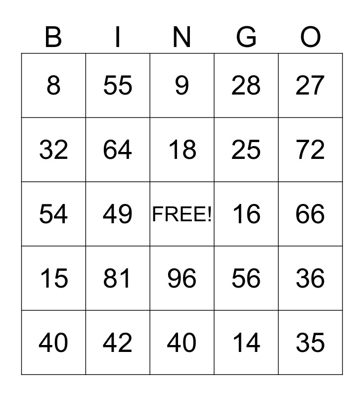 This bingo card has a free space and 24 words: 81, 42, 18, 40, 27, 8, 32, 55, 16, 96, 25, 54, 56, 36, 64, 14, 66, 9, 72, 49, 35, 15, 28 and 40.