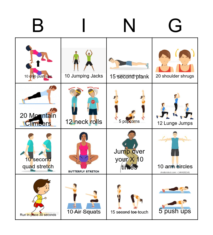 This bingo card has 16 images and 15 words: 10 Air Squats, 10 arm circles, 15 second plank, 10 crab push ups, 10 second quad stretch, 10 Jumping Jacks, Jump over your X 10 times, 15 second toe touch, 20 Mountain Climbers, 12 neck rolls, Run in place 30 seconds, 20 shoulder shrugs, 12 Lunge Jumps, 5 popcorns and 5 push ups.