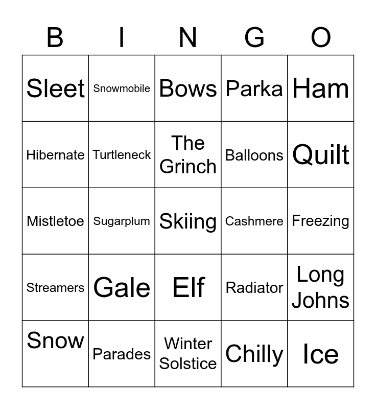 This bingo card has 185 words: Christmas Tree, Garland, Snow, Icicles, Cookies, Fireplace, Eggnog, AppleCider, Lights, Kinara, Reindeer, Menorah, Tis the Season, Dreidel, The Grinch, Stockings, Santa, Mrs. Claus, Giving, Family, Sugar Bowl, Frosty, Peacoat, Sun Bowl, Cake, Down Coat, Flurries, Fruitcake, Ice Scraper, Hockey Stick, Hand Warmer, Mittens, Fiesta Bowl, Cotton Bowl, St Lucia's Day, Marshmallows, Party Horn, Furnace, Fireplace, Countdown, Festival of Lights, Carols, Pie, Heater, Smores, Ham, Chimney, Blanket, Confetti, Polar Vortex, Parades, Rose Bowl, Chilly, Balloons, Duvet, Earmuffs, Fleece, Puck, Cookies, Frosty, Jacket, Muffler, Polar Bear, Skiing, Snowboarding, Ice, Las Posadas, Turtleneck, Chestnut, Star, Arctic, Brisk, Frigid, Winter Wonderland, Cranberries, Freeze Warning, Sleigh, Apples, Hoppin' Johns, Tamales, Ballet, Pink Pig, Clara, Crown of Lights, Liberty Bowl, Roast, Nutmeg, Sleet, Pine Needles, Eggnog, Flannel, Ice Skates, Melt, Penguin, Snow Shoes, Slush, Toboggan, Gust, Blustery, Twinkling Lights, Warm Blanket, Bows, Winter Solstice, Ham, Party Hats, Carroling, Abominable Snow Man, Cashmere, Overcast, Fire, Snowboard, Snood, Sugarplum, Walnut, Presents, Below Freezing, Black Ice, Ringing Bells, Frost Advisory, Gingerbread, Mouse King, Peach Drop, Ebenezer Scrooge, Rudolph, Festival of Harvest, Football, Cinnamon, Streamers, Tree Lighting, Evergreen, Earflap Hat, Freezing, Ice Fishing, Long Johns, Parka, Quilt, Sledding, Snowplow, Candles, Coal, Nutcracker, Pecan, Dreary, Bitter Cold, Festive, Jingle Bells, Snowmobile, Black Eye Peas, King Cake, Nutcracker Prince, Elf, Chimney, Polar Vortex, Spruce, Pinecone, Firewood, Freezing Rain, Hibernate, Insulation, Jack Frost, Log, Pullover, Radiator, Dog Sled, Thaw, Snowfall, Hazelnut, Advent, Frozen, Gale, Cozy Blanket, Ribbons, Curling, Collard Greens, Sparklers, Party Poppers, Mistletoe, Dreidel, Kwanza, Hannukah, Ornaments, Tree Topper, Stockings, Holly and St. Nick.