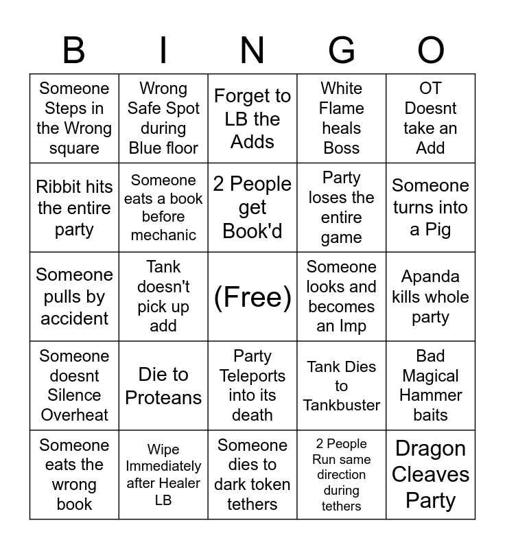 This bingo card has a free space and 24 words: Die to Proteans, Wipe Immediately after Healer LB, 2 People get Book'd, Someone eats the wrong book, OT Doesnt take an Add, Someone Steps in the Wrong square, Ribbit hits the entire party, Wrong Safe Spot during Blue floor, Someone looks and becomes an Imp, Party Teleports into its death, Party loses the entire game, Someone pulls by accident, Tank Dies to Tankbuster, Bad Magical Hammer baits, Someone eats a book before mechanic, 2 People Run same direction during tethers, Apanda kills whole party, Forget to LB the Adds, Someone turns into a Pig, Tank doesn't pick up add, Dragon Cleaves Party, Someone doesnt Silence Overheat, White Flame heals Boss and Someone dies to dark token tethers.
