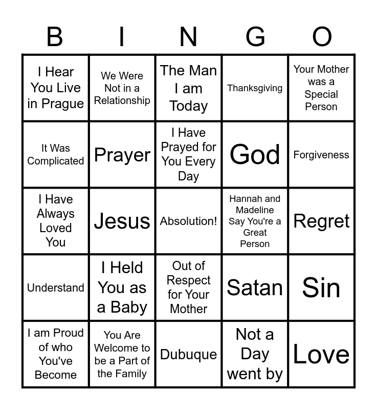 This bingo card has a free space and 24 words: I Held You as a Baby, You Are Welcome to be a Part of the Family, I Have Prayed for You Every Day, I am Proud of who You've Become, Your Mother was a Special Person, I Hear You Live in Prague, It Was Complicated, We Were Not in a Relationship, Hannah and Madeline Say You're a Great Person, Out of Respect for Your Mother, God, I Have Always Loved You, Satan, Sin, Prayer, Not a Day went by, Regret, The Man I am Today, Forgiveness, Jesus, Love, Understand, Thanksgiving and Dubuque.