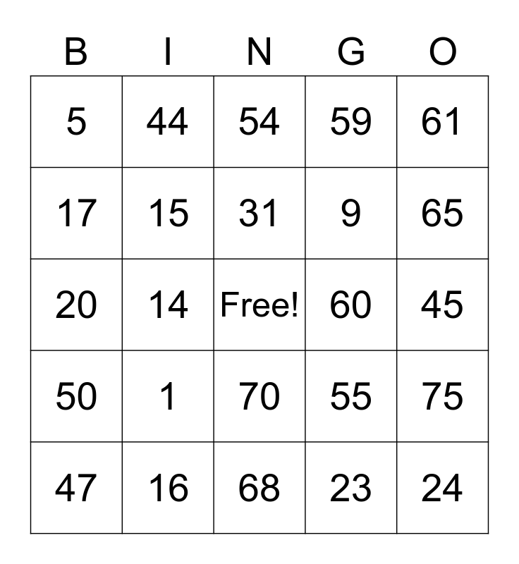 This bingo card has a free space and 24 words: 1, 16, 31, 47, 61, 5, 17, 44, 60, 70, 9, 20, 55, 75, 15, 23, 45, 54, 65, 14, 24, 50, 59 and 68.
