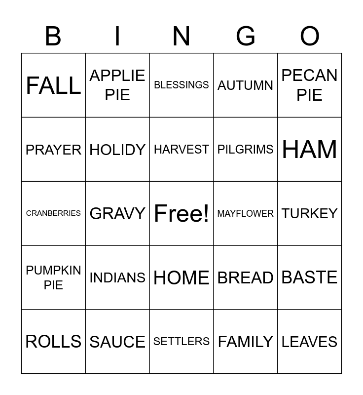 This bingo card has a free space and 30 words: SAUCE, PARADE, GRAVY, FEAST, FALL, BLESSINGS, HOLIDY, HOME, MAYFLOWER, SETTLERS, TURKEY, LEAVES, FAMILY, ACORNS, HAM, CELEBRATE, BREAD, PUMPKIN PIE, INDIANS, PECAN PIE, CRANBERRIES, PUMPKIN, APPLIE PIE, PILGRIMS, PRAYER, AUTUMN, BASTE, ROLLS, HARVEST and YAMS.