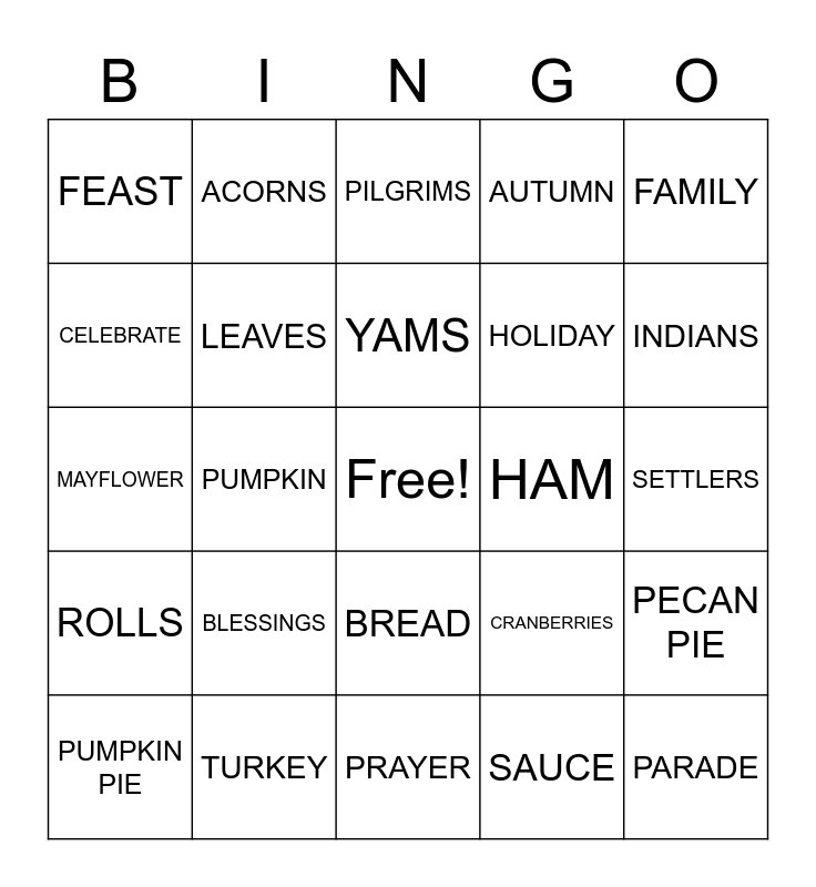 This bingo card has a free space and 30 words: TURKEY, HARVEST, PUMPKIN, APPLE PIE, FEAST, PILGRIMS, LEAVES, BREAD, HAM, PRAYER, SETTLERS, PARADE, SAUCE, FALL, INDIANS, GRAVY, CRANBERRIES, ROLLS, BLESSINGS, FAMILY, MAYFLOWER, HOME, ACORNS, HOLIDAY, CELEBRATE, AUTUMN, PECAN PIE, PUMPKIN PIE, YAMS and BASTE.