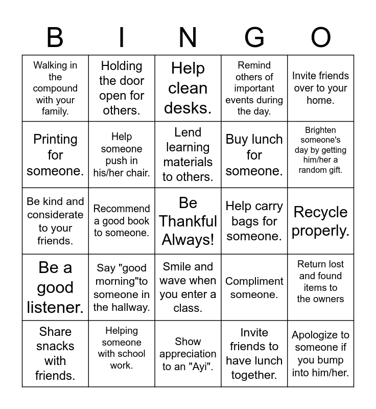 This bingo card has a free space and 24 words: Say "good morning"to someone in the hallway., Helping someone with school work., Lend learning materials to others., Share snacks with friends., Invite friends over to your home., Walking in the compound with your family., Printing for someone., Holding the door open for others., Help carry bags for someone., Smile and wave when you enter a class., Buy lunch for someone., Be kind and considerate to your friends., Compliment someone., Return lost and found items to the owners, Help someone push in his/her chair., Invite friends to have lunch together., Recycle properly., Help clean desks., Brighten someone's day by getting him/her a random gift., Recommend a good book to someone., Apologize to someone if you bump into him/her., Be a good listener., Remind others of important events during the day. and Show appreciation to an "Ayi"..